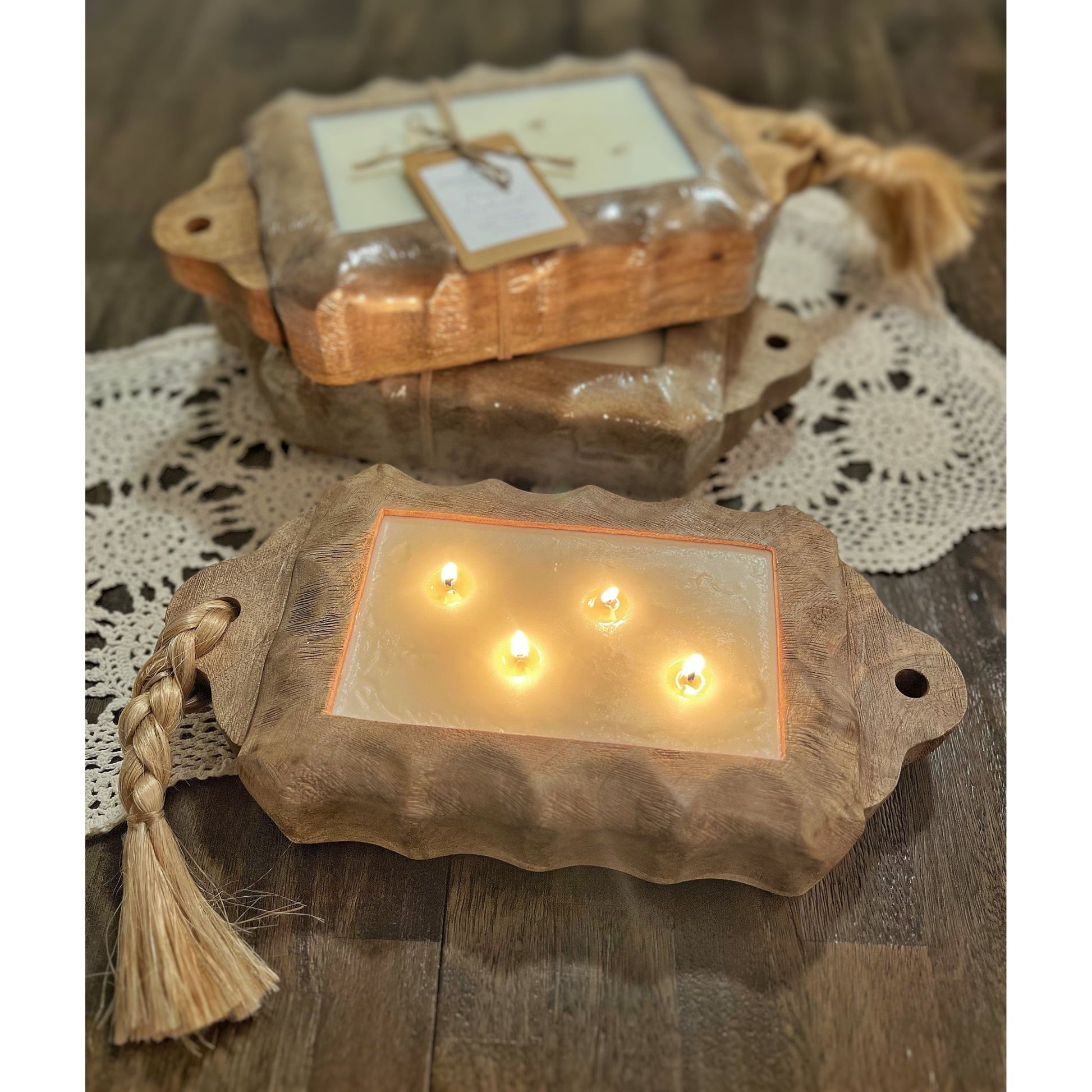 Our Harbor Tray is hand carved from sustainable mango wood by talented artisans in India and made exclusively for our Brand. It is hand poured with 28 ounces of 100% USA grown soy wax, premium fragrance oils and 4 cottons wicks, by our team in Davenport Washington.